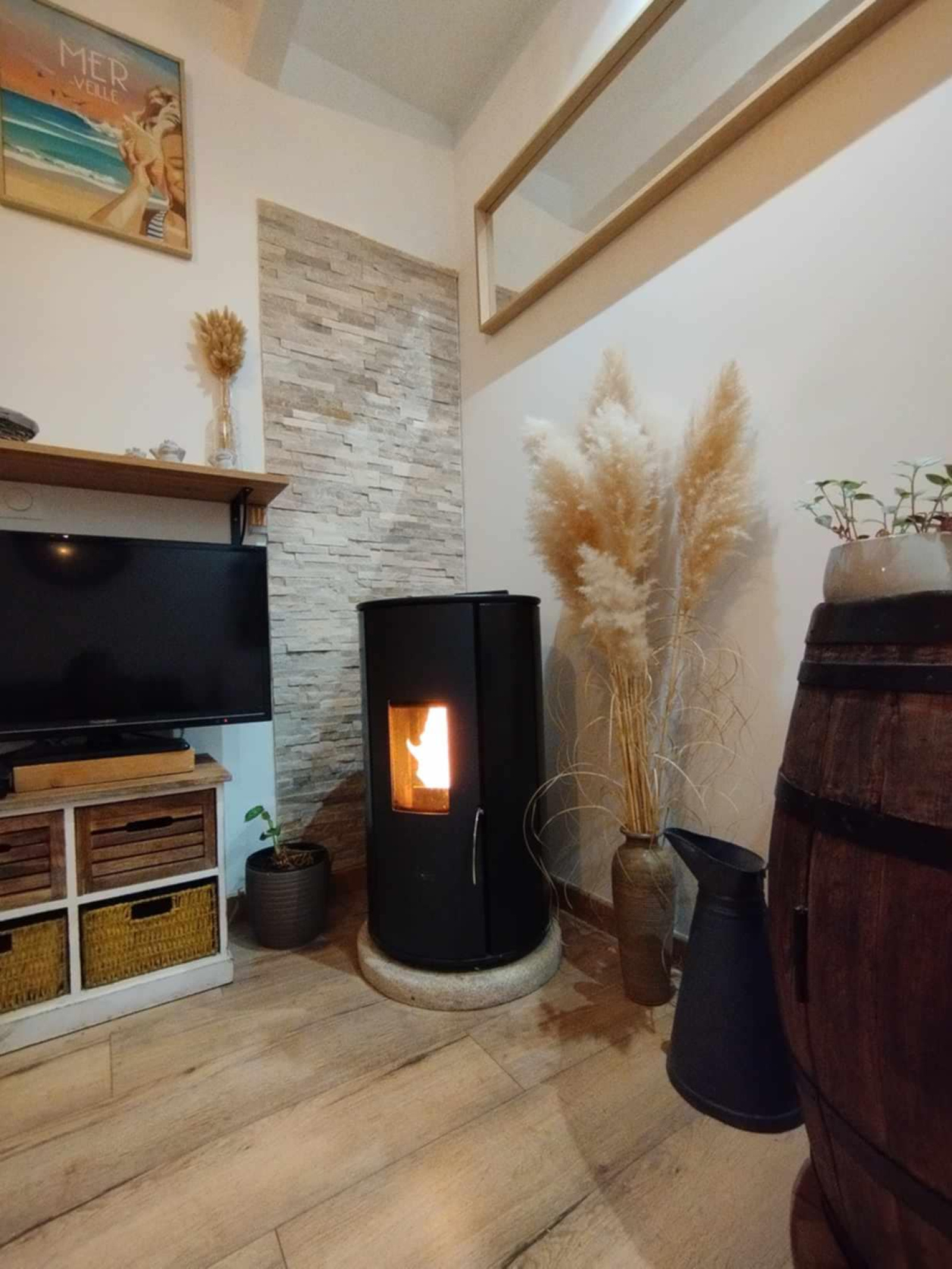 Cette maison a été récemment rénovée avec soin, alliant confort et modernité. Le chauffage est assuré par un poêle à granulés performant, avec un complément de radiateurs électriques pour un confort optimal.