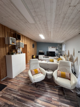 Cette belle longère est composée d'un salon très spacieux donnant d'un coté sur la terrasse et le jardin, et de l'autre coté, sur le séjour avec placards intégrés.