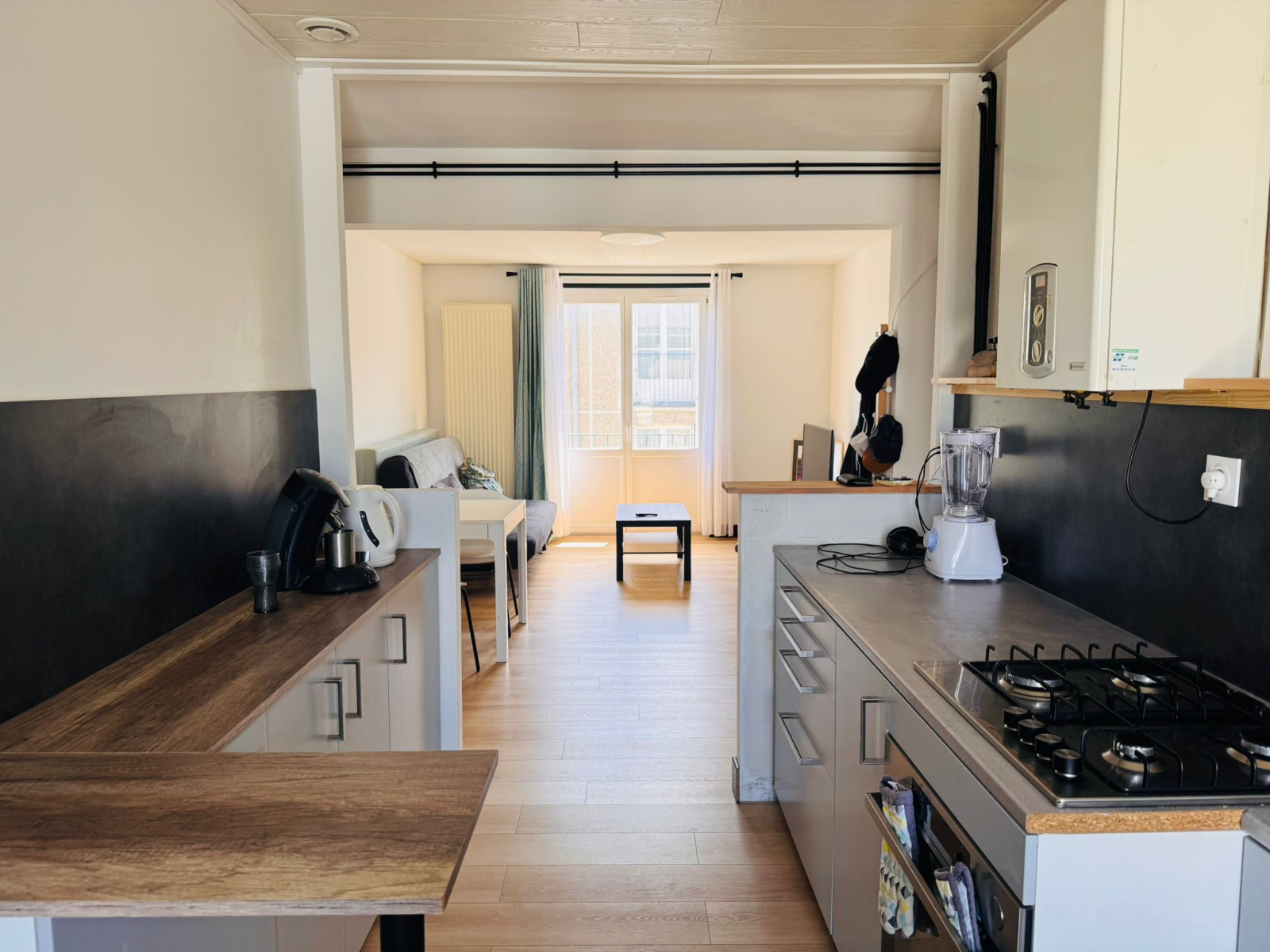 Il se compose d'une belle cuisine aménagée et équipée ouverte sur une lumineuse pièce à vivre, deux chambres avec rangements, une salle d'eau, wc séparé, une cave.