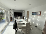 D’une surface actuelle de 144 m², elle se compose au rez-de-chaussée d’une grande salle à manger lumineuse ouverte sur une cuisine équipée, d’une buanderie, d’un WC, d’une salle de bains et d’un vaste salon chaleureux avec pierres apparentes et poêle à bois.